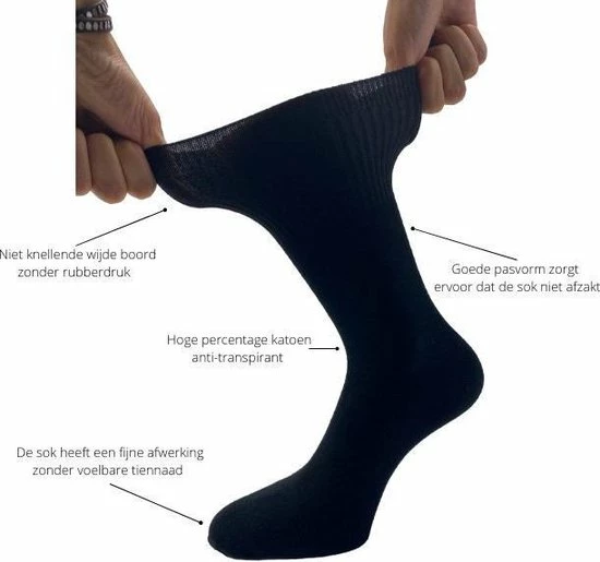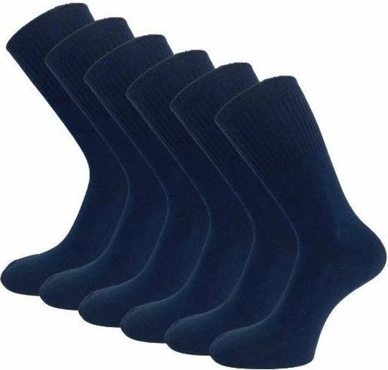 Set van 6 paar diabetes sokken van het merk SQOTTON in de kleur marineblauw. Deze sokken zijn geschikt voor diabetici dankzij de speciaal gebreide drukvrije boord. Hierdoor blijven de sokken goed zitten maar knellen de sokken niet aan je benen. Daarbij hebben deze diabetessokken een handgekettelde teennaad, een fijne afwerking waardoor de teennaad niet meer voelbaar is. De sokken zijn gemaakt van 95% katoen en 5% elastaan, hierdoor zijn de sokken ademend, anti-transpirerend, comfortabel en zacht voor je huid. Deze diabetessokken zijn verkrijgbaar in maat 39-42 en 43-46.
