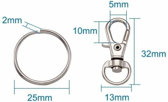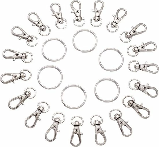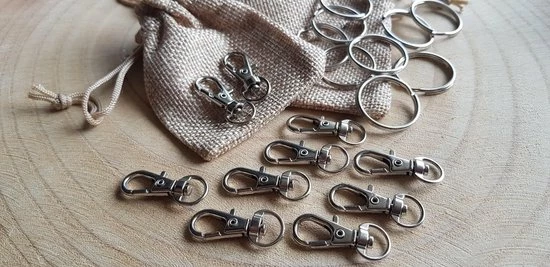 10 sets, dus totaal 20 onderdelen, verdeeld alsvolgt: 10 karabijnhaken en 10 sleutelringen